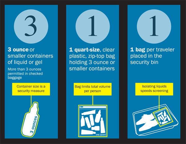 3-1-1 for carry-on = 3 ounce bottle or less; 1 quart-sized, clear, plastic, zip-top bag; 1 bag per passenger placed in screening bin. One-quart bag per person limits the total liquid volume each traveler can bring. 3 oz container size is a security measure.